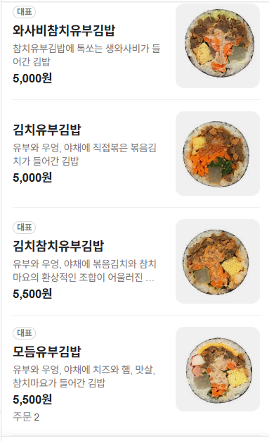 - 주문 팁: [ 원조유부김밥 괜찮음 ]