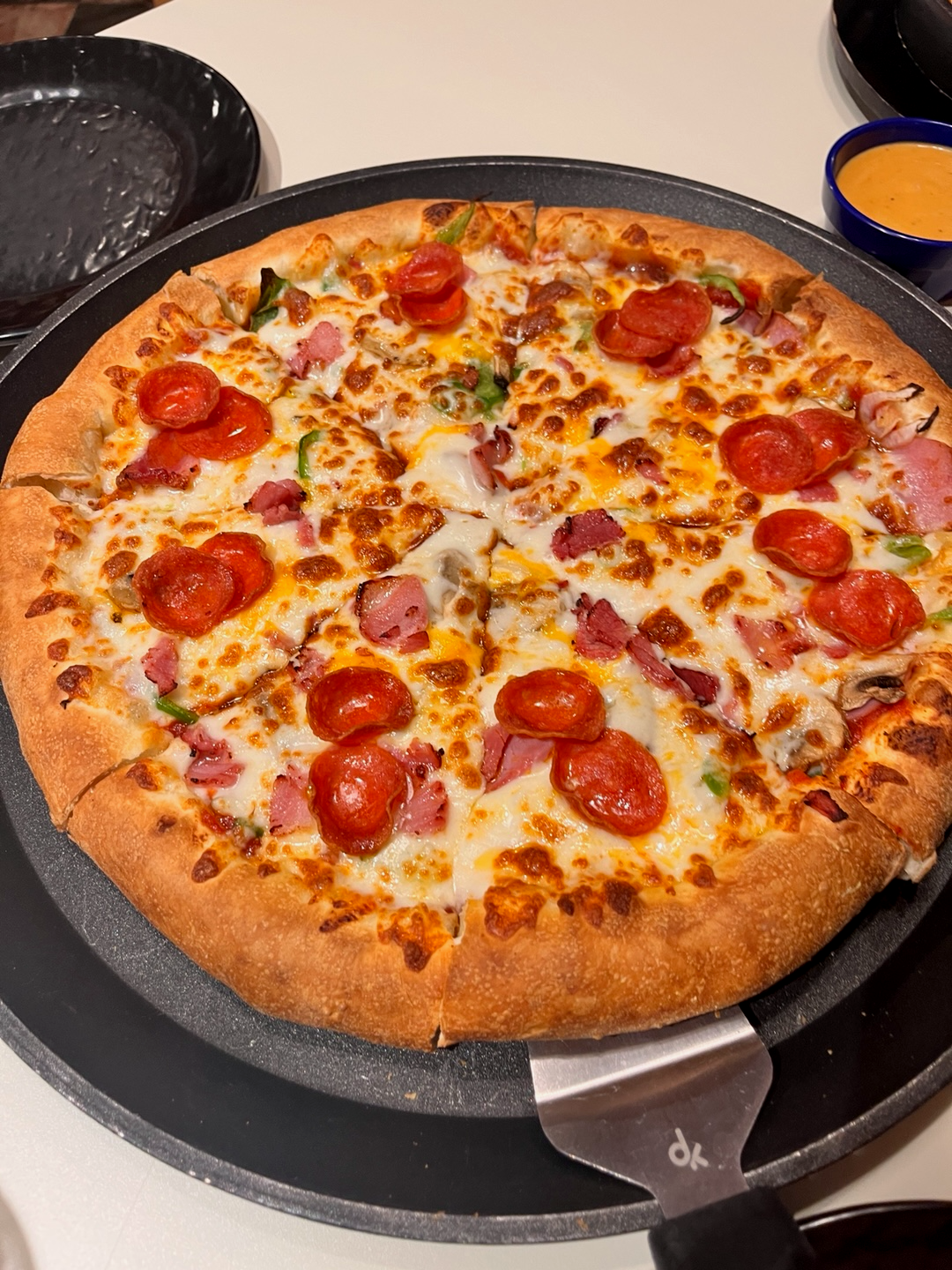 버섯, 페퍼로니, 피망, 양파, 햄, 베이컨 등 클래식한 조합으로 무난하게 즐기기 좋았지만, 올리브가 없었던 점은 살짝 아쉬웠습니다.